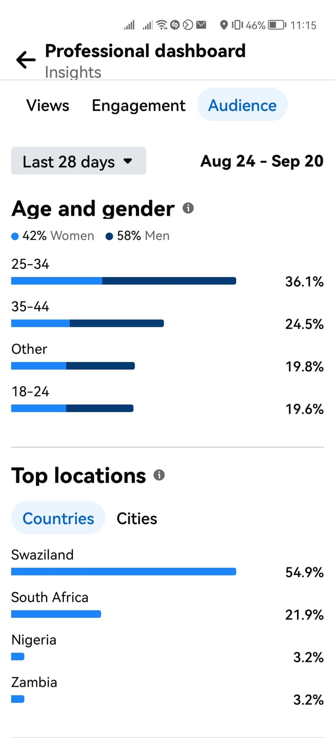 • Age & Gender: The community is young and vibrant, led by the 25–34 age group (36.1%), followed closely by 35–44 (24.5%). Men make up 58% of the audience, while women account for 42%.
