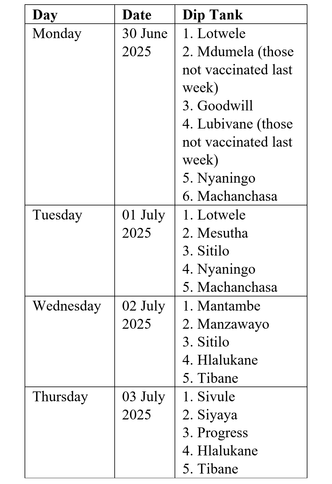 The farmers will be serviced according to the dip tanks at which their domestic animals are registered. Vaccination time starts at 6am. The Ministry pleads with all of the livestock farmers to make sure that all of their cattle are availed for vaccination, as this will go a long way in making sure that the disease is contained and eventually eliminated.